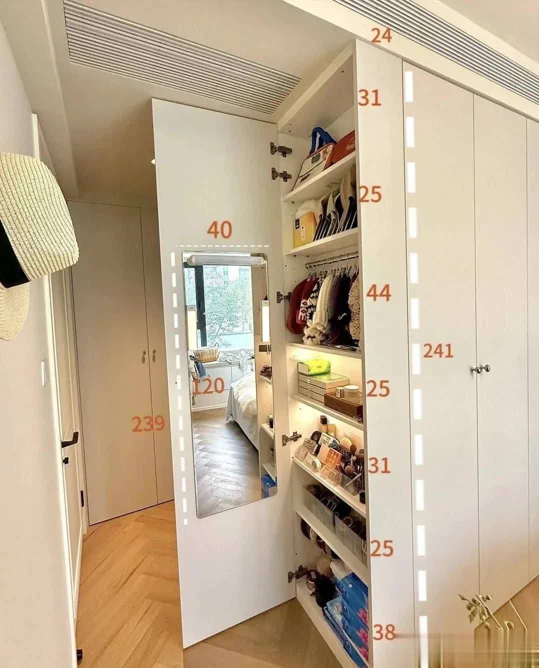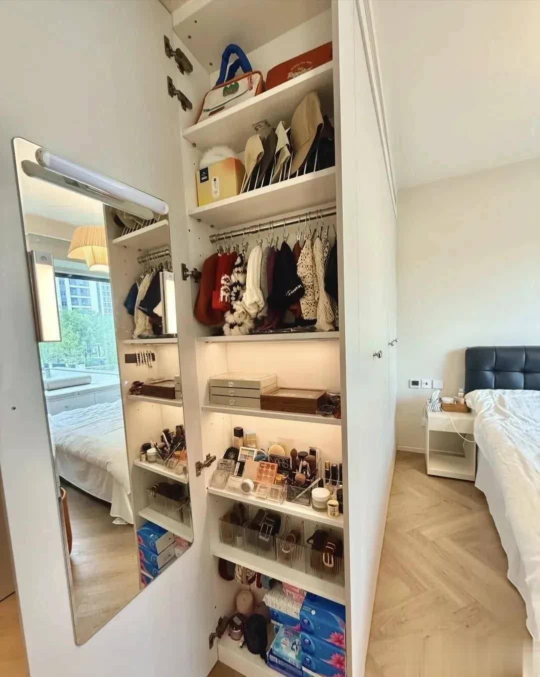 卧室太小摆不下梳妆台?试试在衣柜侧边留20公分做个薄柜。网友“竹小歪”家的这个设计,成了朋友参观时必夸的亮点:层板能调高度,矮的放口红、首饰,高的放护肤品;柜门背后贴块全身镜,化妆、试衣服一站搞定;镜子两边装两个磁吸灯,暖光打在脸上,化妆时不会因为顶光“下手重”。