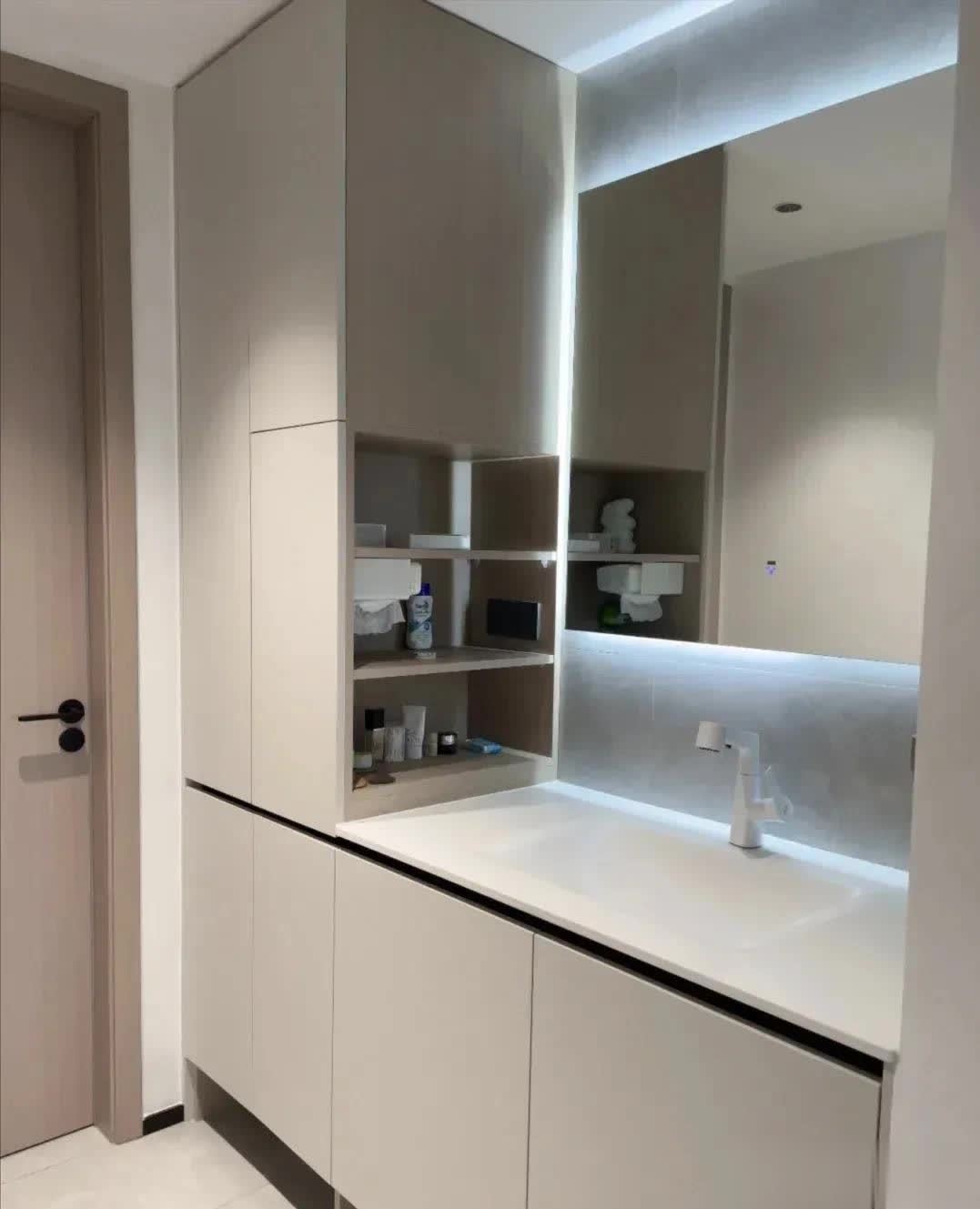 有人把高柜和洗手盆做成一体,侧边留开放格放牙杯,台面用热弯一体盆,没有拼接缝,擦桌子时拿抹布一擦到底。“以前洗手台每天都要理,现在一周擦一次都干净,媳妇说这是装修最对的决定。”