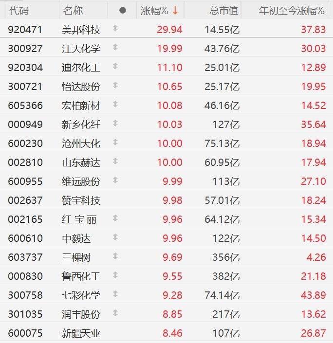 1月20日,A股市场化工板块午后涨幅进一步扩大,其中,美邦科技30CM涨停,江天化学此前20CM涨停配资论坛,宏柏新材、新乡化纤、沧州大化、山东赫达、维远股份、赞宇科技、红宝丽、中毅达10CM涨停,鲁西化工逼近涨停。