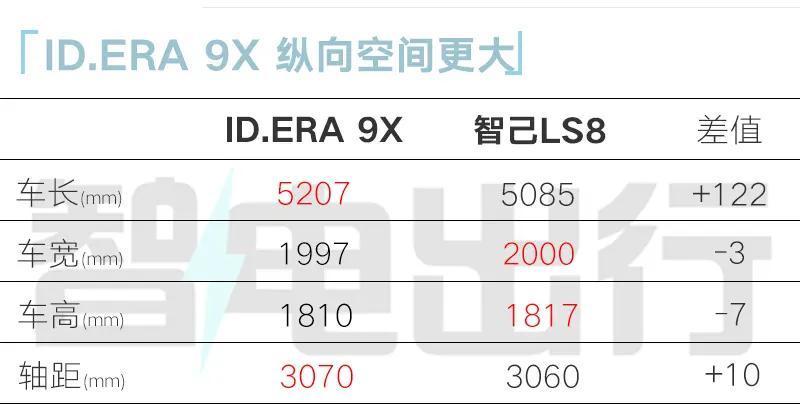 ID.ERA 9X在纵向空间上更占优势:车长比LS8多出122mm,轴距多10mm,车内乘坐的空间会更大。