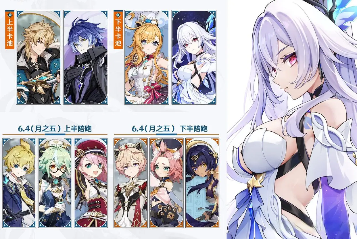 另外就是6.4版本的卡池安排也终于敲定下来了,上半依旧是菲林斯陪跑法尔伽,下半爱可菲和丝柯克复刻。上半陪跑的四星角色是米卡,砂糖和夏洛蒂。下半陪跑的四星角色是塔莉雅,迪奥娜和坎蒂丝。