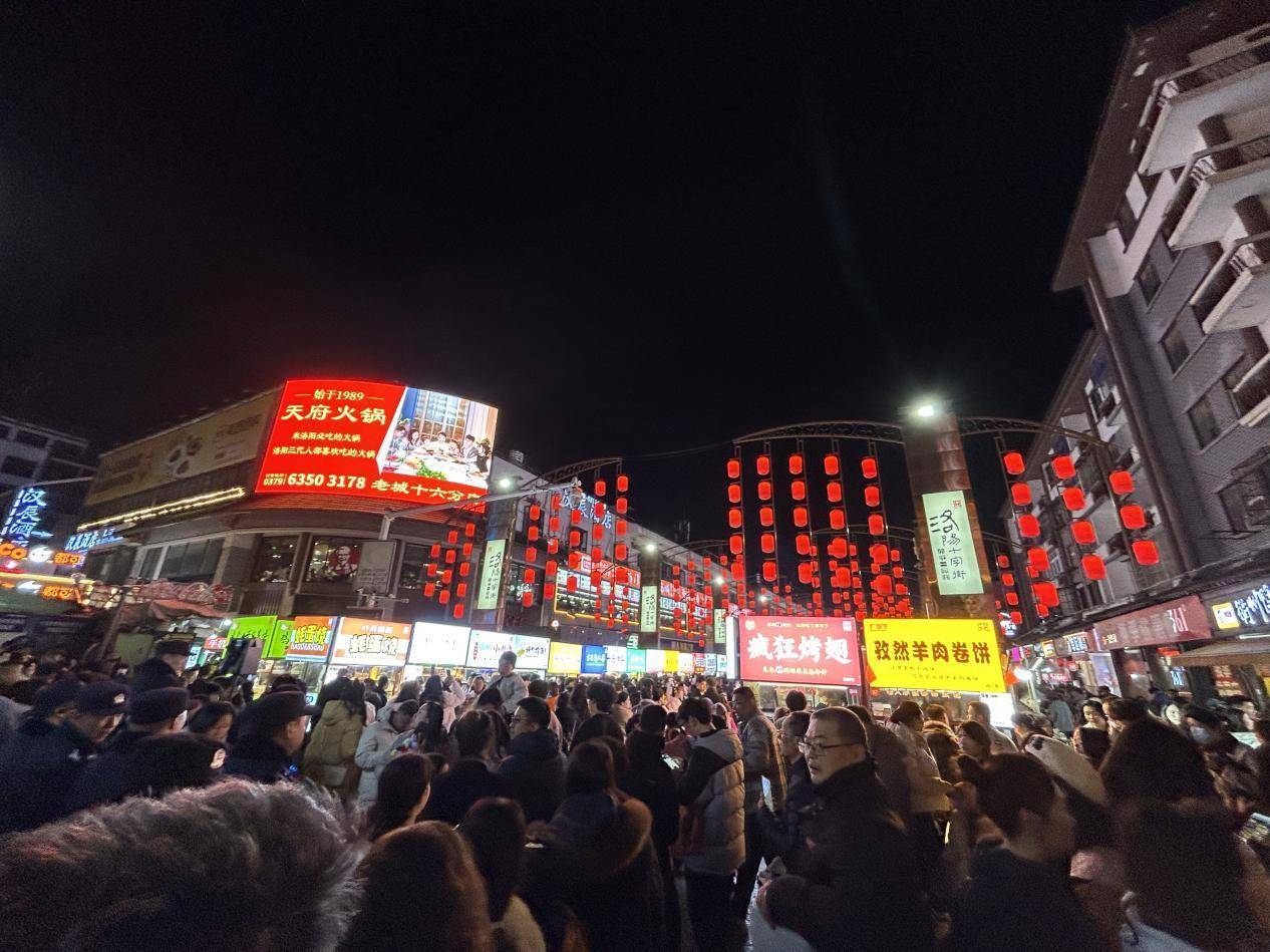 (夜幕下,洛阳市老城区十字街人潮涌动。)
