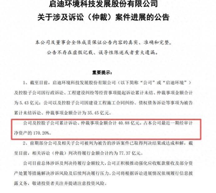 启迪环境称,鉴于公司目前涉诉总体金额较大且部分案件相继审结进入履行阶段,公司整体面临诉讼风险及流动性压力,公司正在全力推动诉讼及执行风险化解工作,积极与相关各方进行沟通,力争尽快妥善解决上述涉诉案件。
